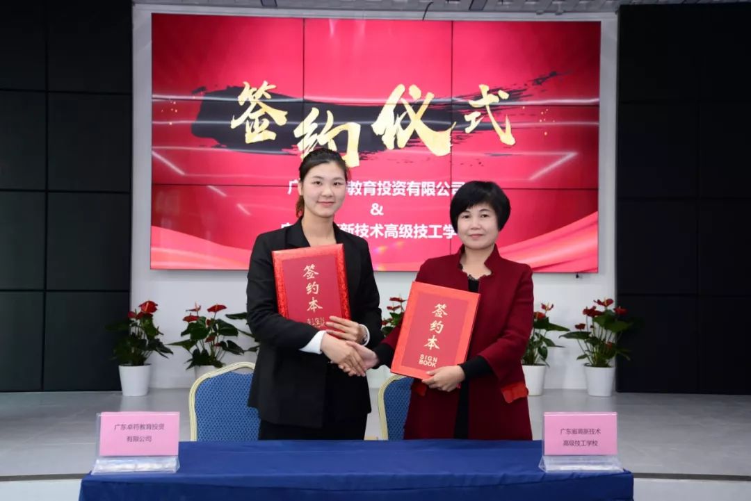 廣東卓符教育投資有限公司蓓蕾實驗幼兒園園領導游堯與廣東省高新技術高級技工學校執行校長肖中圓簽定合作協議。